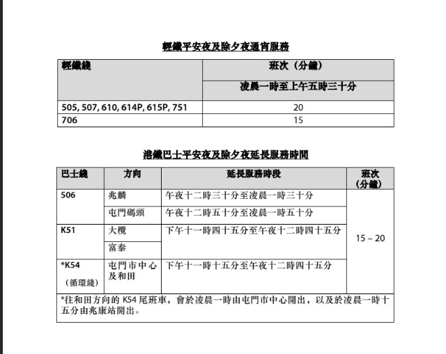 · 3條巴士線(506、K51及K54)延長服務(wù)時間