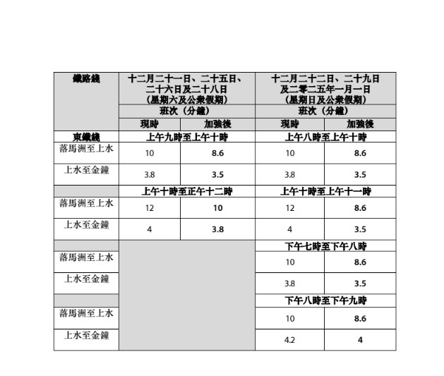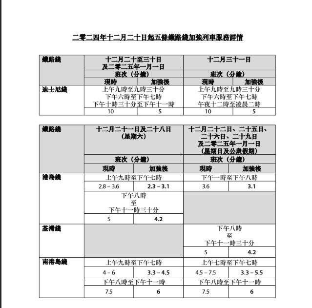 另外,港鐵在12月20日起至2025年1月1日會在不同時段加強列車服務(wù),港島線及南港島線會在周末及假日大部份時間加密班次,至約3-4分鐘一班車;12月31日除夕下午3點開始行駛晚上繁忙時段班次,3-5分鐘一班車。