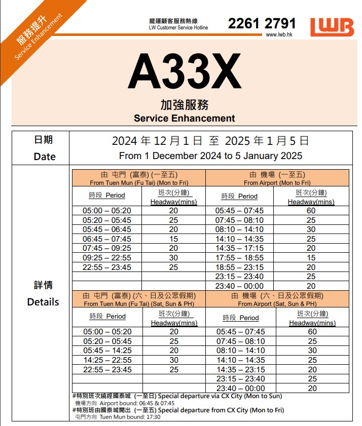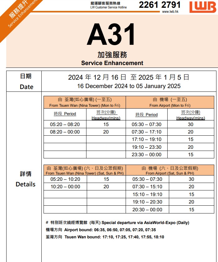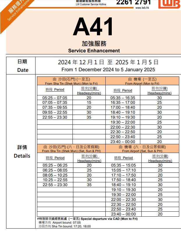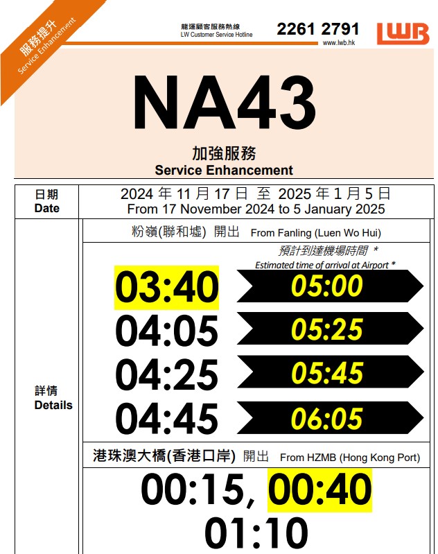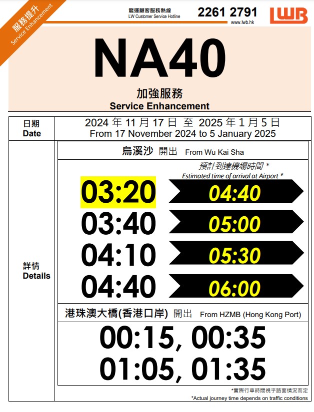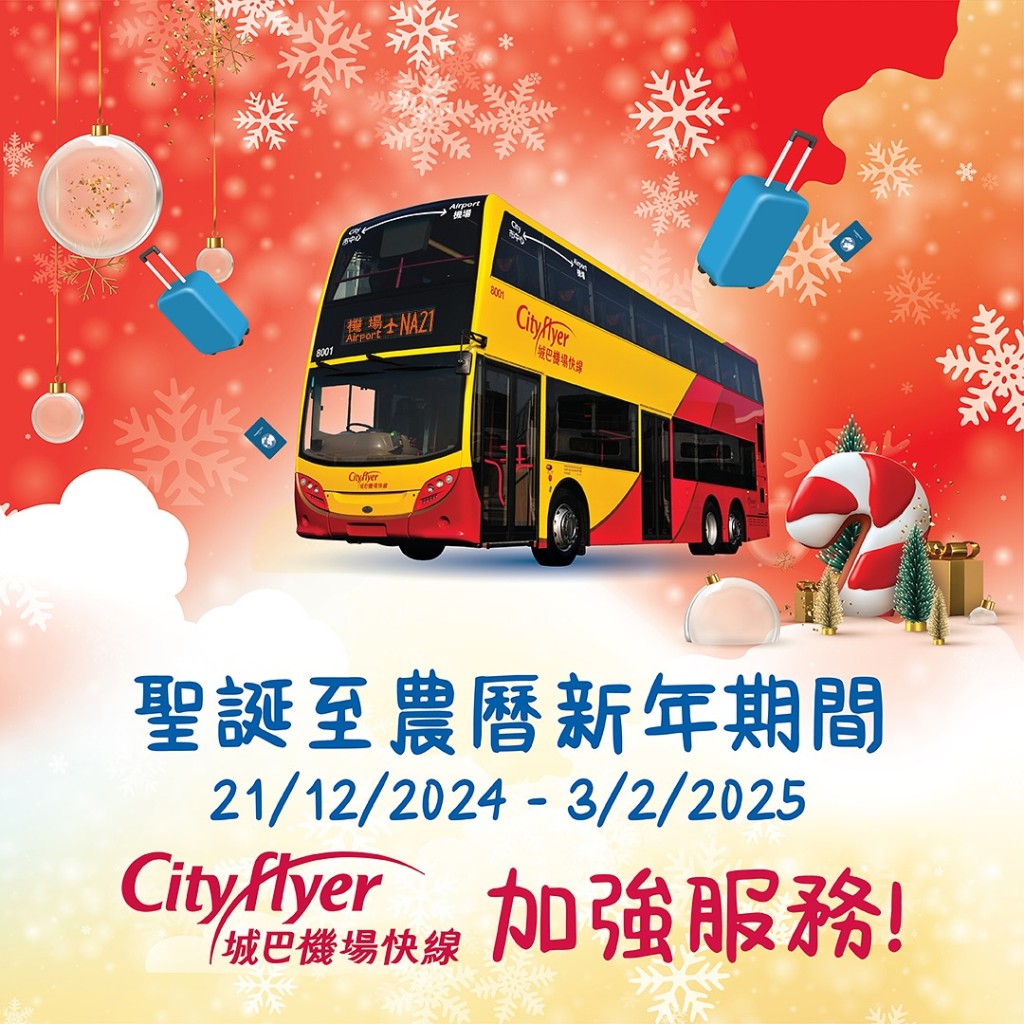 另外,由即日起至2025年2月3日,城巴加強NA路線服務(wù),包括NA21港珠澳大橋香港口岸/機場往返旺角、NA10鴨脷洲往返機場/港珠澳大橋香港口岸、NA12杏花邨往返機場/港珠澳大橋香港口岸 、NA29將軍澳(寶琳)往返機場/港珠澳大橋香港口岸及各日間路線加強清晨時段班次,便利市民有市區(qū)前往機場。