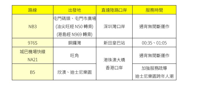 ▲為配合深圳灣口岸通宵運作,城巴除夕夜額外開辦口岸通宵路線NB3,及976S路線。 城巴