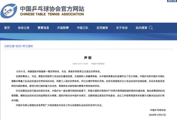▲中國(guó)乒協(xié)網(wǎng)頁(yè)今日發(fā)出聲明。