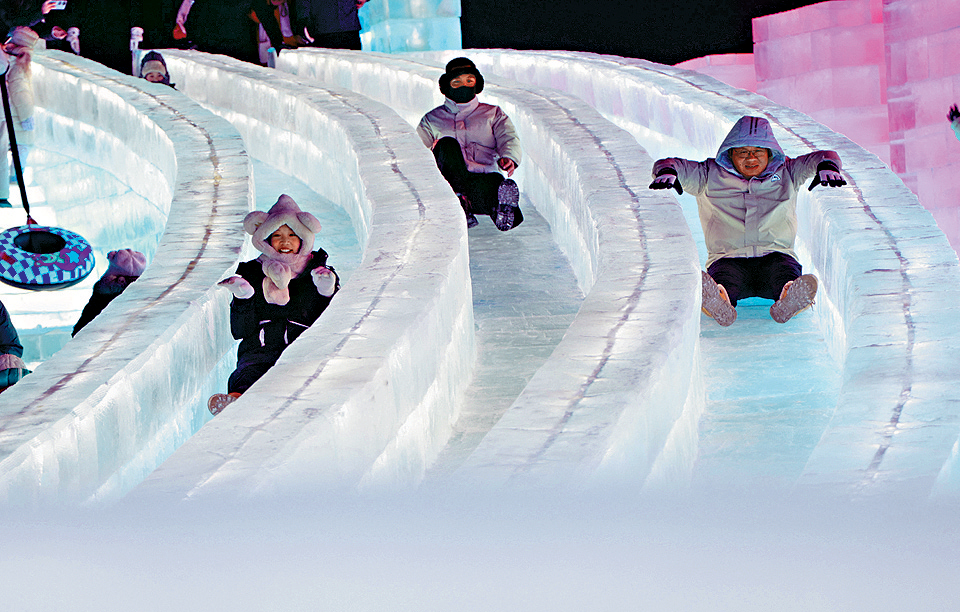 ▲冰滑梯是哈爾濱冰雪大世界其中一項最受歡迎的玩意。