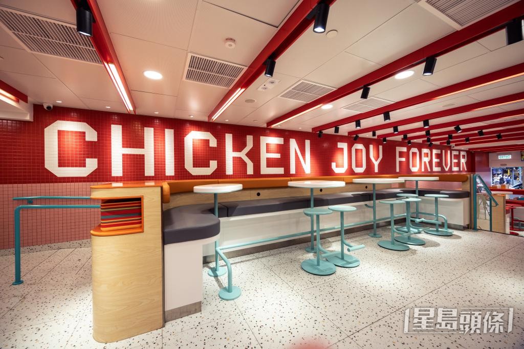 去年,Jollibee翻新了北角英皇道的門店,該概念店的設(shè)計理念,源于品牌核心價值——為顧客來快樂,用色和設(shè)計上較為活潑,在原有的紅色上加上鮮橙、粉綠等顏色,牆身為時下流行的拼花磚牆,不僅注重視覺效果,也設(shè)置了多種座位,包括舒適卡座和高身吧枱座位?,F(xiàn)場所見,不少座位有提供充電插位,并增添了自助點餐機(jī)。