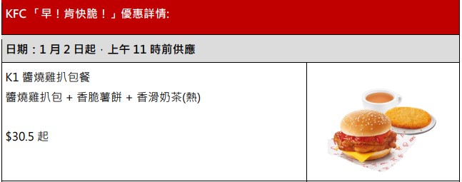 KFC “平日!肯抵 Deal!”優(yōu)惠詳情|1 月 2 日起 只限星期一至五,不適用于星期一至五內(nèi)之公眾假期(上午11 時(shí)前供應(yīng)):