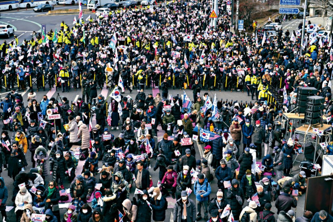 ▲總統(tǒng)尹錫悅的支持者周五在首爾總統(tǒng)官邸附近集會,抗議法院簽發(fā)拘捕令拘捕尹錫悅。