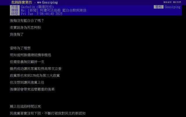 臺灣民眾黨前主席柯文哲涉京華城圖利等案,臺北地方法院昨日更裁再度羈押禁見。一名資深柯粉小草3日在PTT的八卦版發(fā)文,后悔當(dāng)初沒有藍(lán)白合,沒想到讓民進黨上任,后續(xù)卻會帶來這么嚴(yán)重的后果。