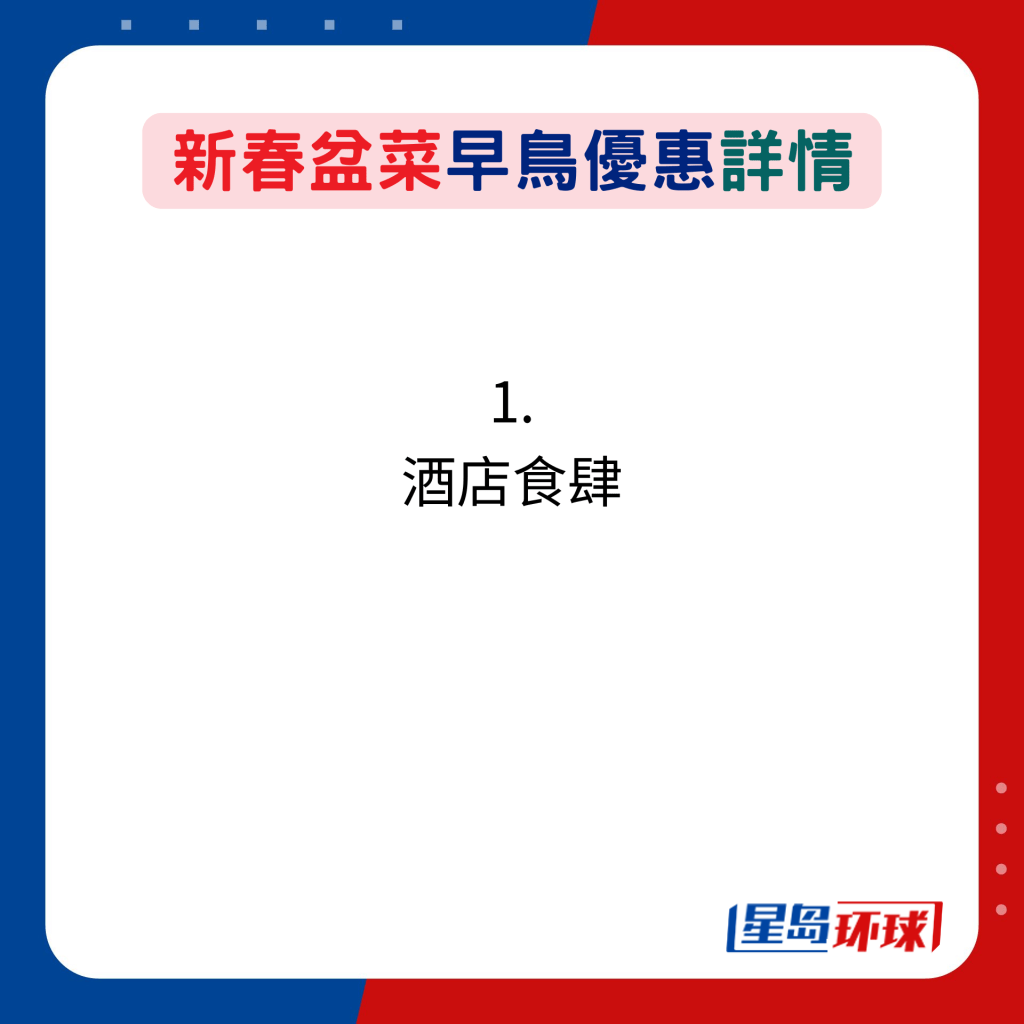 新春盆菜早鳥優(yōu)惠詳情:1. 酒店食肆