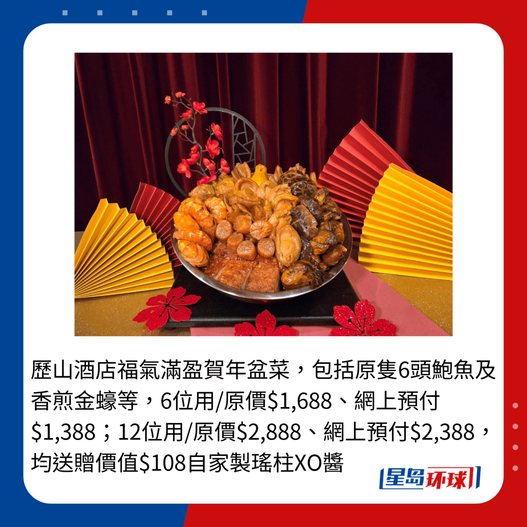 歷山酒店福氣滿盈賀年盆菜,包括原只6頭鮑魚及香煎金蠔等