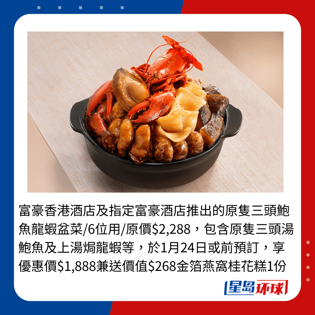 富豪香港酒店及指定富豪酒店推出的原只三頭鮑魚龍蝦盆菜