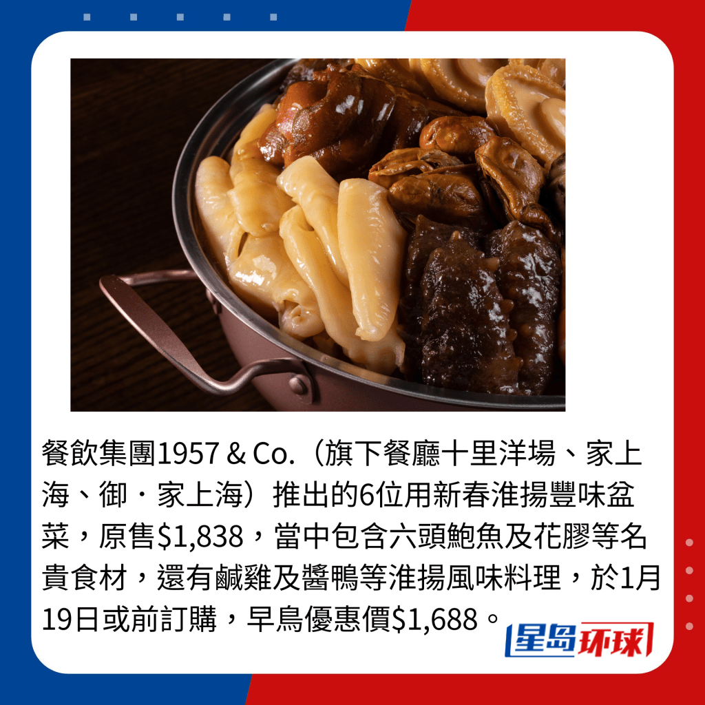 喜歡特色風(fēng)味的盆菜,也不乏選擇。同樣提供堂食或外賣自取的新加坡福建餐廳莆田,其“盆滿缽滿鮑魚大蝦盆菜”包含莆田南日島的八頭大鮑魚、莆田哆頭村的蟶干及福州魚丸等美食,只要于1月11日或前預(yù)訂及繳付訂金,可享88折。至于餐飲集團(tuán)1957 & Co.的6位用新春淮揚(yáng)豐味盆菜,當(dāng)中包含六頭鮑魚及花膠等名貴食材,還有咸雞及醬鴨等淮揚(yáng)風(fēng)味料理,原售$1,838,趕及1月19日或前訂購,可享早鳥優(yōu)惠價(jià)$1,688。