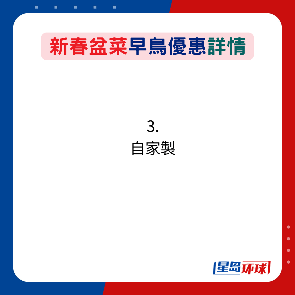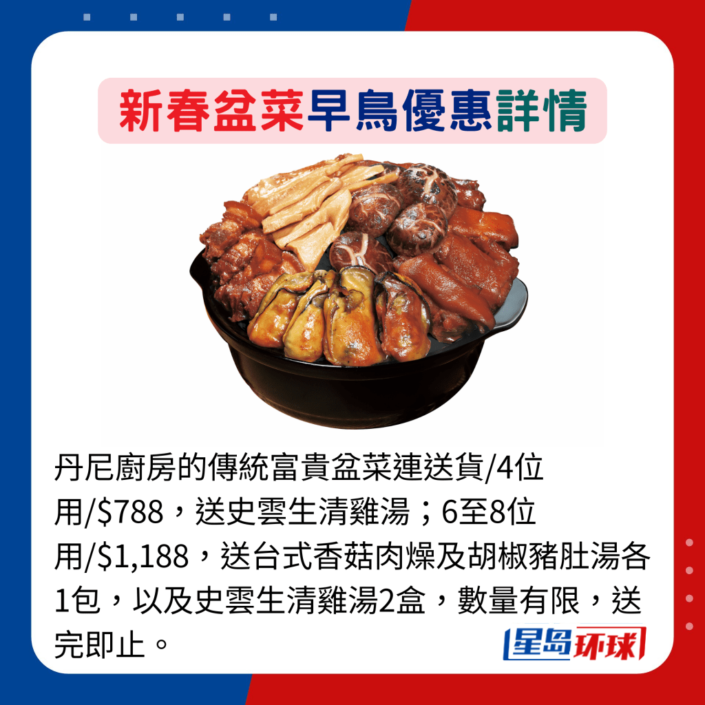 新春盆菜早鳥優(yōu)惠詳情:3. 自家制