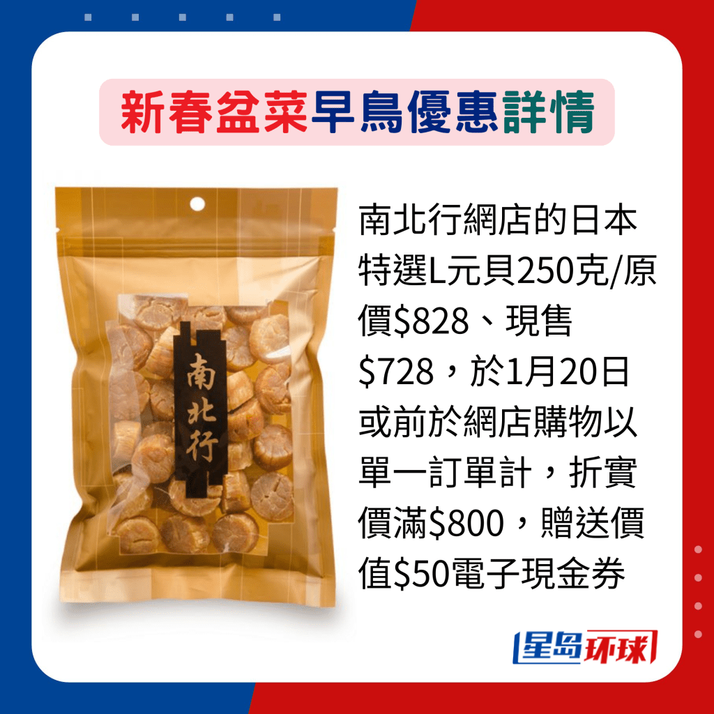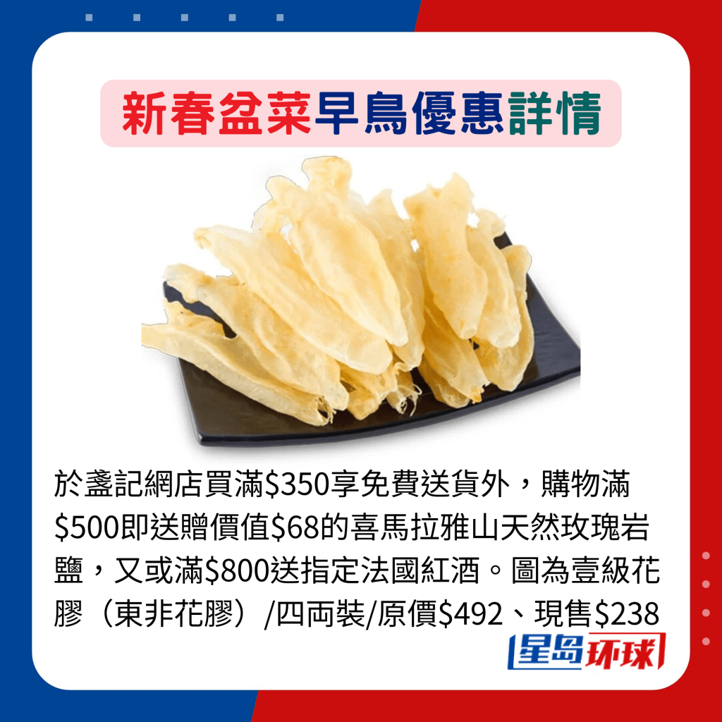 打算自制盆菜,必備珍貴海味食材,南北行網(wǎng)店由即日至1月20日推出優(yōu)惠,折實(shí)買滿$500,即送鮑汁螺片1罐。 期間單一訂單計(jì)折實(shí)買滿$800,即送電子現(xiàn)金券$50,可于下次購物滿$500時(shí)使用。主售參茸海味產(chǎn)品的盞記,其網(wǎng)店亦推出多項(xiàng)購物優(yōu)惠,除了買滿$350享免費(fèi)送貨外,購物滿$500即送贈(zèng)價(jià)值$68的喜馬拉雅山天然玫瑰巖鹽,又或滿$800送指定法國紅酒。