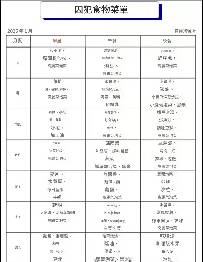 韓國(guó)網(wǎng)友取得首爾看守所1月的收容人飲食菜單,引發(fā)關(guān)注。文件顯示,看守所的早餐有餃子湯、蘿卜湯、香腸配面包、明太魚湯;午餐則有馬鈴薯湯、豬肉蓋飯、辣炒年糕、炸醬麵、解酒湯、泡菜湯等;而晚餐則是有香辣雞絲湯、大醬湯、辣燉雞湯、豆腐鍋和咖哩飯等。