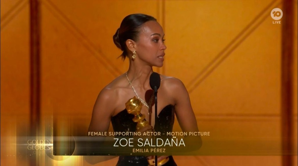 首個(gè)頒發(fā)的獎(jiǎng)項(xiàng)是電影喜劇組最佳女配角,素兒莎丹娜(Zoe Saldana)憑《毒王女人夢(mèng)》擊敗拍檔Selena Gomez、《魔法壞女巫》Ariana Grande等贏得獎(jiǎng)項(xiàng),她首度獲金球提名就得獎(jiǎng),激動(dòng)得哭起來,她以英語及西班牙語感謝《毒》片其他拍檔,又指會(huì)跟拍檔分享殊榮。之后頒發(fā)劇集喜劇組最佳女主角,結(jié)果由大熱的Jeans Smart憑《職業(yè)槍手》贏得,她第3度獲金球提名,并第2度獲獎(jiǎng)。