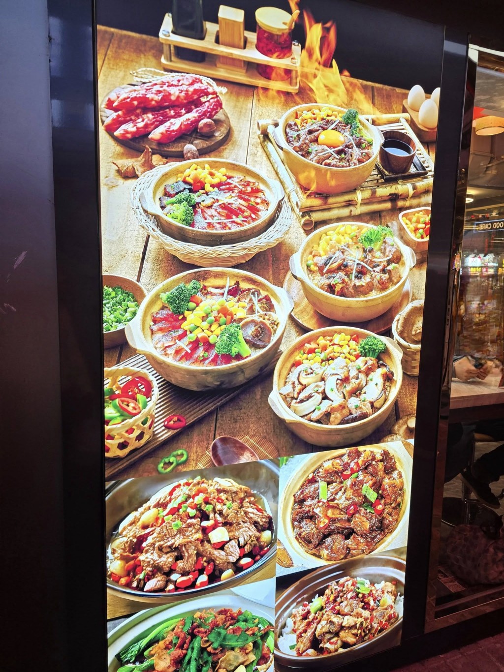 ▲店外的宣傳照,煲仔飯款式與香港常見的口味不盡相同。(“全港店鋪消息”FB圖片)
