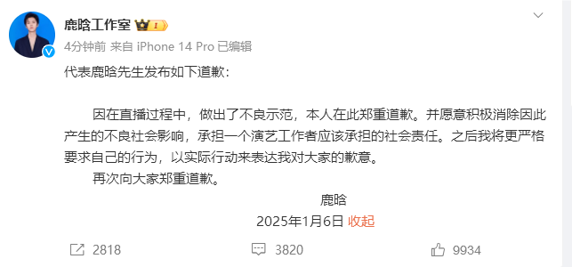 影星鹿晗疑醉酒直播爆粗惹禍,社交帳號遭封禁,工作室致歉