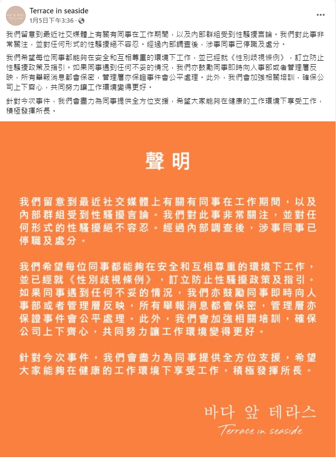連鎖韓式餐廳Terrace in seaside一名女員工在社交平臺發(fā)文,指首日返工“唔夠幾個鐘”已被分區(qū)經理改“大波妹”不雅花名,在工作群組報更的訊息中也以花名稱呼事主,感覺不受尊重。涉事餐廳昨亦有發(fā)表聲明,表示已留意到有同事在工作期間及內部群組受到性騷擾言論,對事件表示關注,經內部調查后,涉事同事已停職及處分。