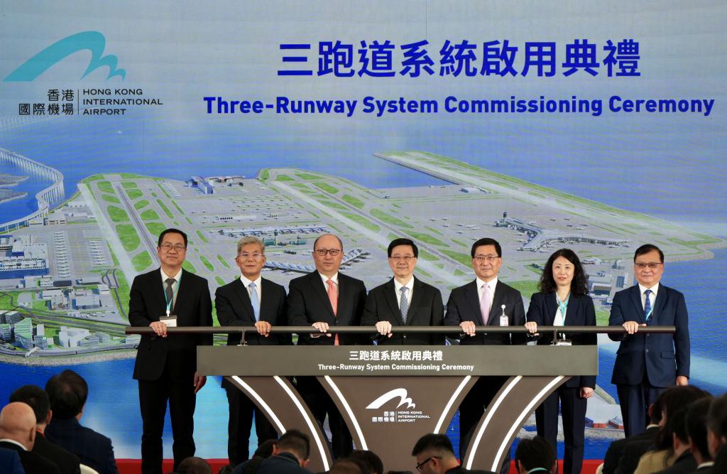 ▲香港國(guó)際機(jī)場(chǎng)三跑道系統(tǒng)去年11月底正式啟用,多名高官出席啟用典禮。