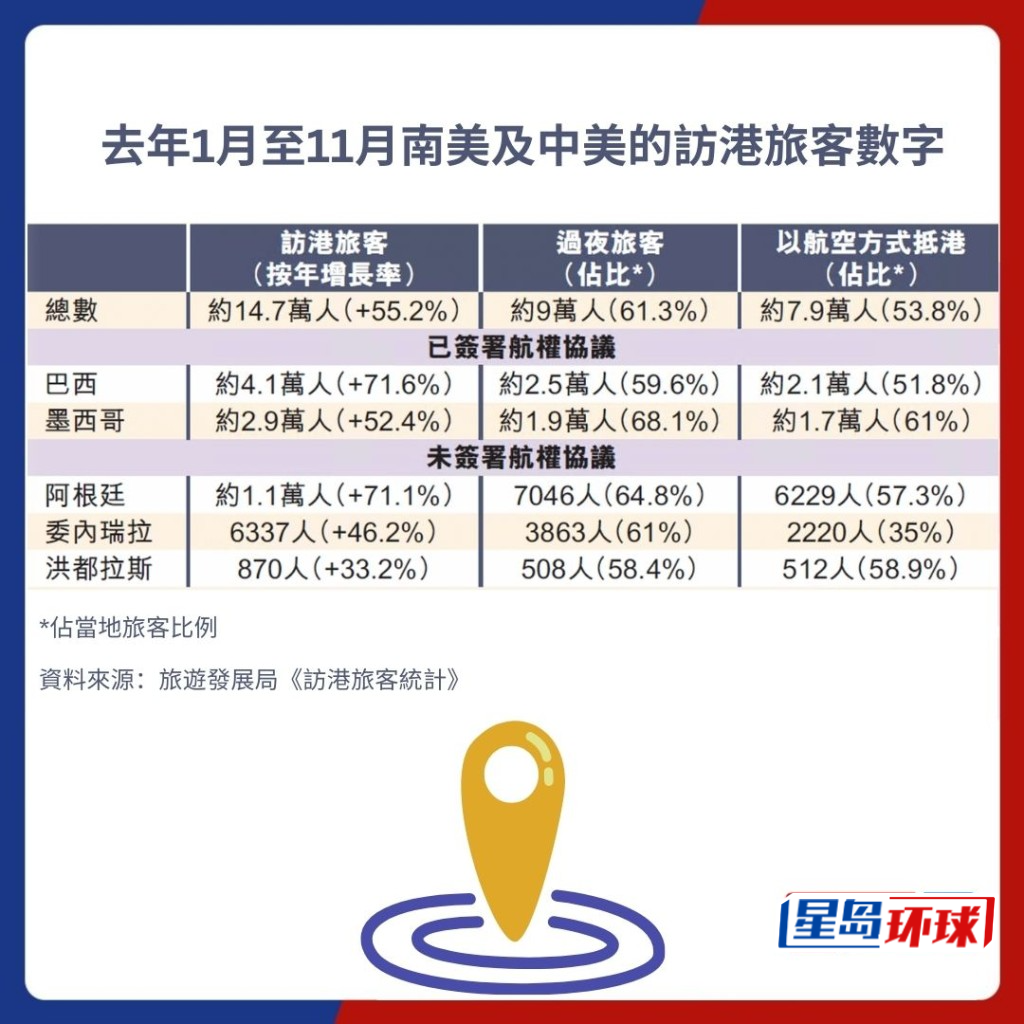 至于未有航權(quán)的地方,多為南美洲地區(qū),如阿根廷、委內(nèi)瑞拉、烏拉圭、智利、玻利維亞及秘魯。參考旅發(fā)局公布最新一份《訪港旅客統(tǒng)計(jì)》(月刊),2024年1至11月共有約14.7萬(wàn)旅客由南美及中美訪港(見表),按年增長(zhǎng)率達(dá)55%。以阿根廷為例,去年首11個(gè)月有約1.1萬(wàn)人訪港,按年增長(zhǎng)71.1%,當(dāng)中60%旅客乘搭飛機(jī)來(lái)港。