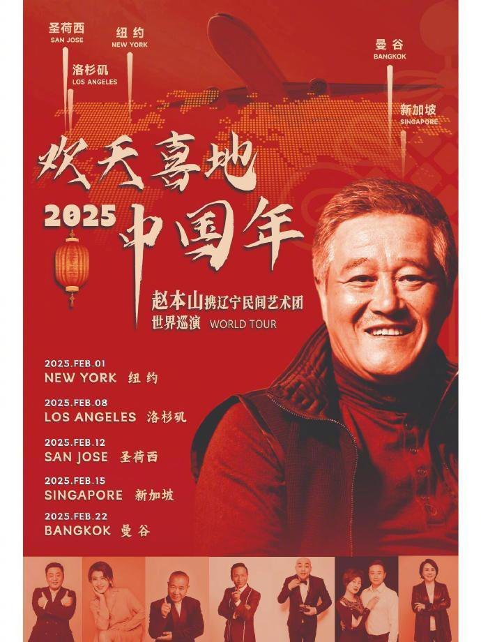 “歡天喜地中國年”是趙本山與遼寧民間藝術團推出的海外巡演,2月起將陸續(xù)在美國紐約、洛杉磯和圣荷西三站及曼谷推出,其中曼谷的演出訂于2月22日。演出陣容包括宋小寶、閆學晶、宋曉峰、王小利等內(nèi)地多名喜劇明星,靚澤文化2024年12月10日在微博上宣布四個站點的門票預售均已售罄。票務平臺顯示,演出最高票價人民幣1969元,最低檔為399元。