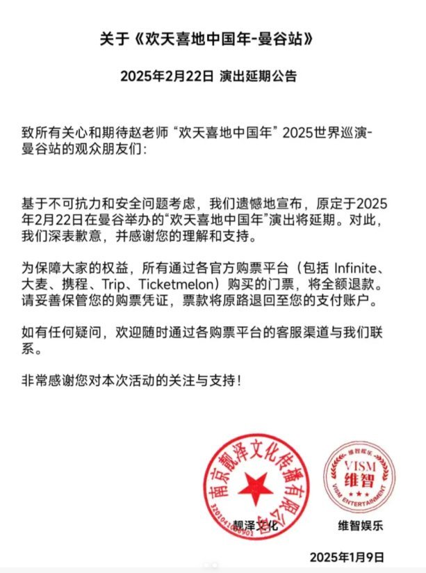 1月9日,演出經(jīng)紀公司靚澤文化發(fā)布公告稱,“基于不可抗力和安全問題考慮,我們遺憾地宣布,原定于2025年2月22日在曼谷舉辦的‘歡天喜地中國年’演出將延期。對此,我們深表歉意,并感謝您的理解和支持?!?/p>