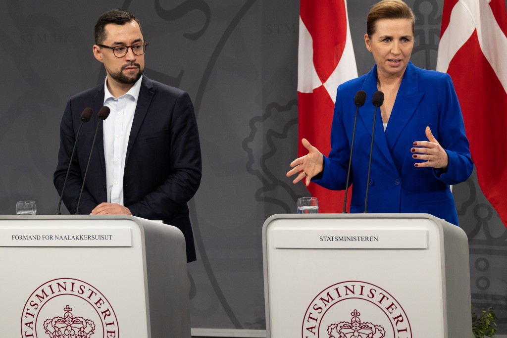丹麥總理與格陵理總理一同出席記者會。 路透社
