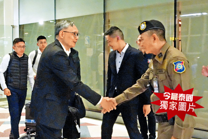 ▲卓孝業(yè)抵達泰國機場時,與接機官方人員握手。
