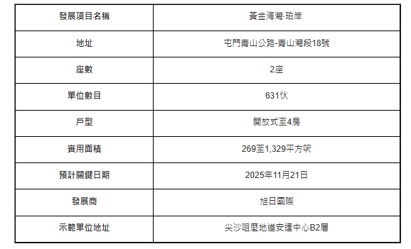 特色單位共設(shè)58伙。佔(zhàn)全盤約10%,面積由269至1329方呎,主要分為各座3樓的連平臺(tái)特色戶及頂層的連天臺(tái)特色戶。多元化間隔能切合不同人士需求,勢(shì)將吸引追求品味生活的用家客及深港兩地投資客。此外,項(xiàng)目預(yù)計(jì)關(guān)鍵日期為2025年11月21日,與第1期黃金海灣?意嵐相同。