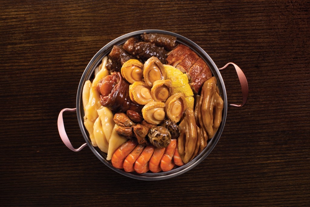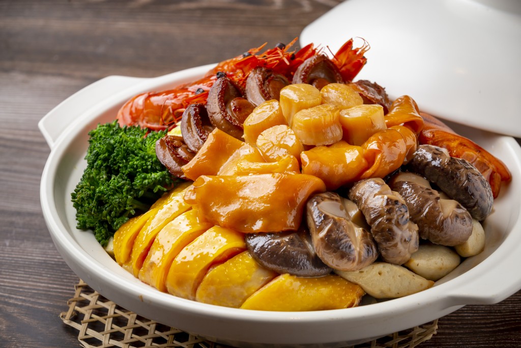 同樣達(dá)到米其林一星水準(zhǔn)的,還有五星級酒店九龍香格里拉的中菜廳香宮,出品的“團(tuán)圓福至豪華盆菜”以頂級食材盡現(xiàn)奢華,精選六頭鮑魚肉質(zhì)緊實,配上大大塊的滋補厚片花膠,令每啖湯底都感受到濃濃膠質(zhì)。其他食材配料有瑤柱、金蠔、扣掌、乳龍蝦、花雕鴿乳皇等等,樣樣都是山珍美味,用以宴客亦絕不失禮。