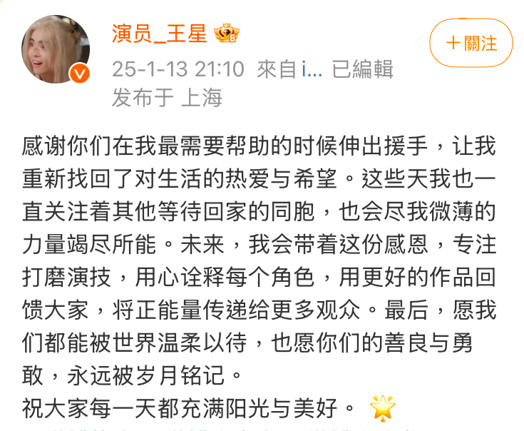 王星本人再發(fā)文感謝網(wǎng)友,表示“重新找回對(duì)生活的熱愛”