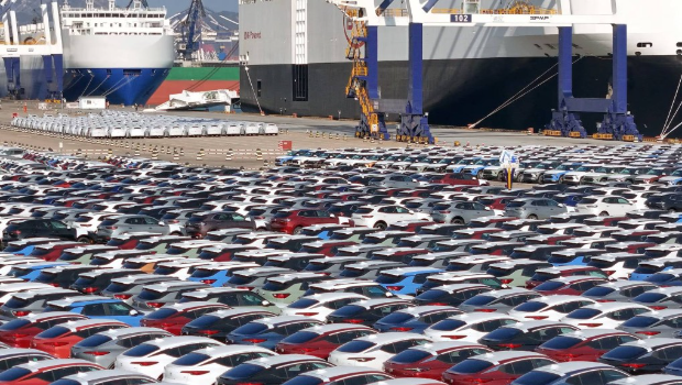 ▲大批國產汽車在山東港口煙臺港集結等待裝船出口。 路透社