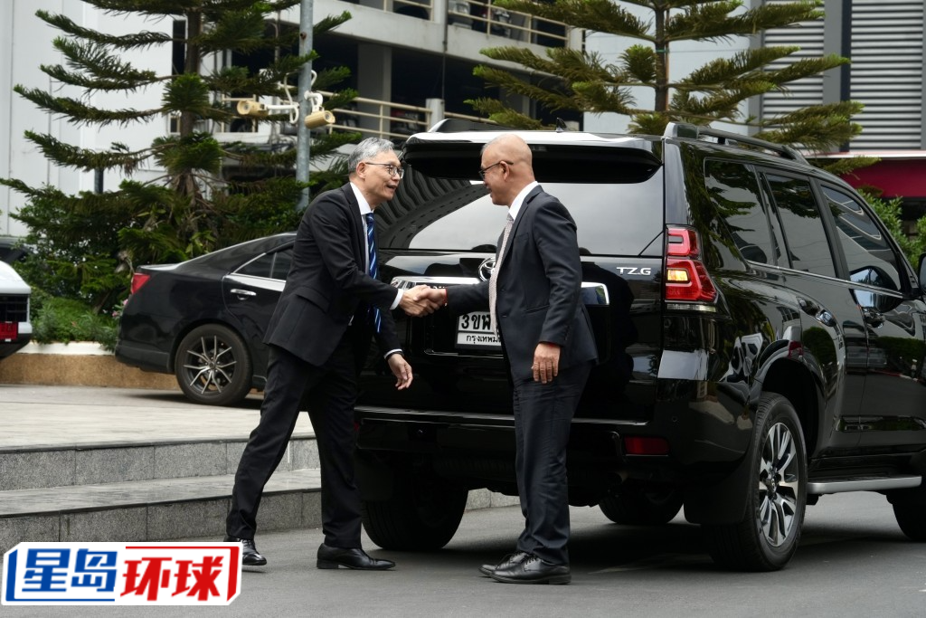 保安局專責小組今早到達泰國皇家警察總部,會見多個當?shù)鼐讲块T。 劉駿軒攝