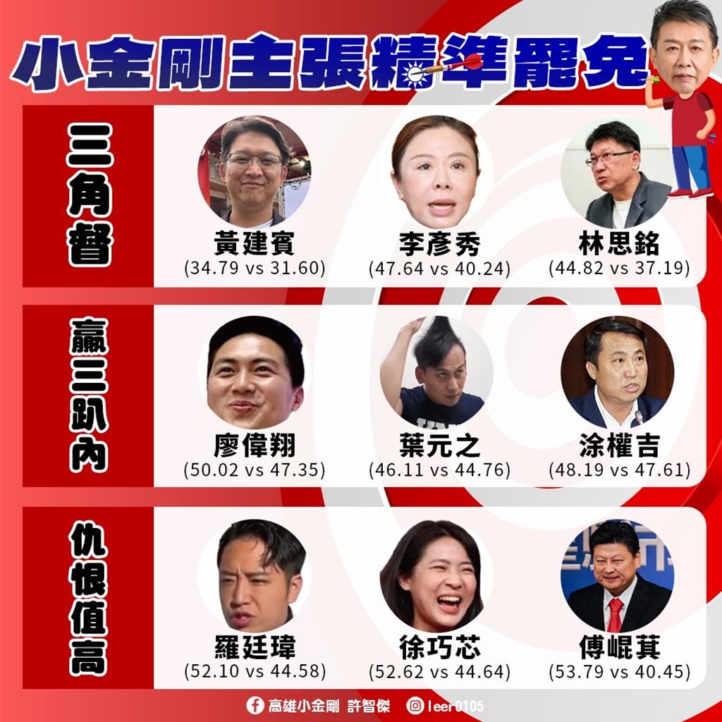 ▲許智杰列出9位藍(lán)委,包含三角督的黃建賓、李彥秀、林思銘,贏3%內(nèi)的廖偉翔、葉元之、涂權(quán)吉,以及仇恨值高的羅廷瑋、徐巧芯、傅昆萁。