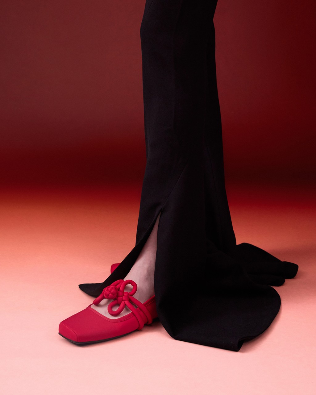Charles & Keith新春系列飾以中國(guó)結(jié)裝飾的紅色Jade瑪莉珍鞋$499,另備黑色版本。
