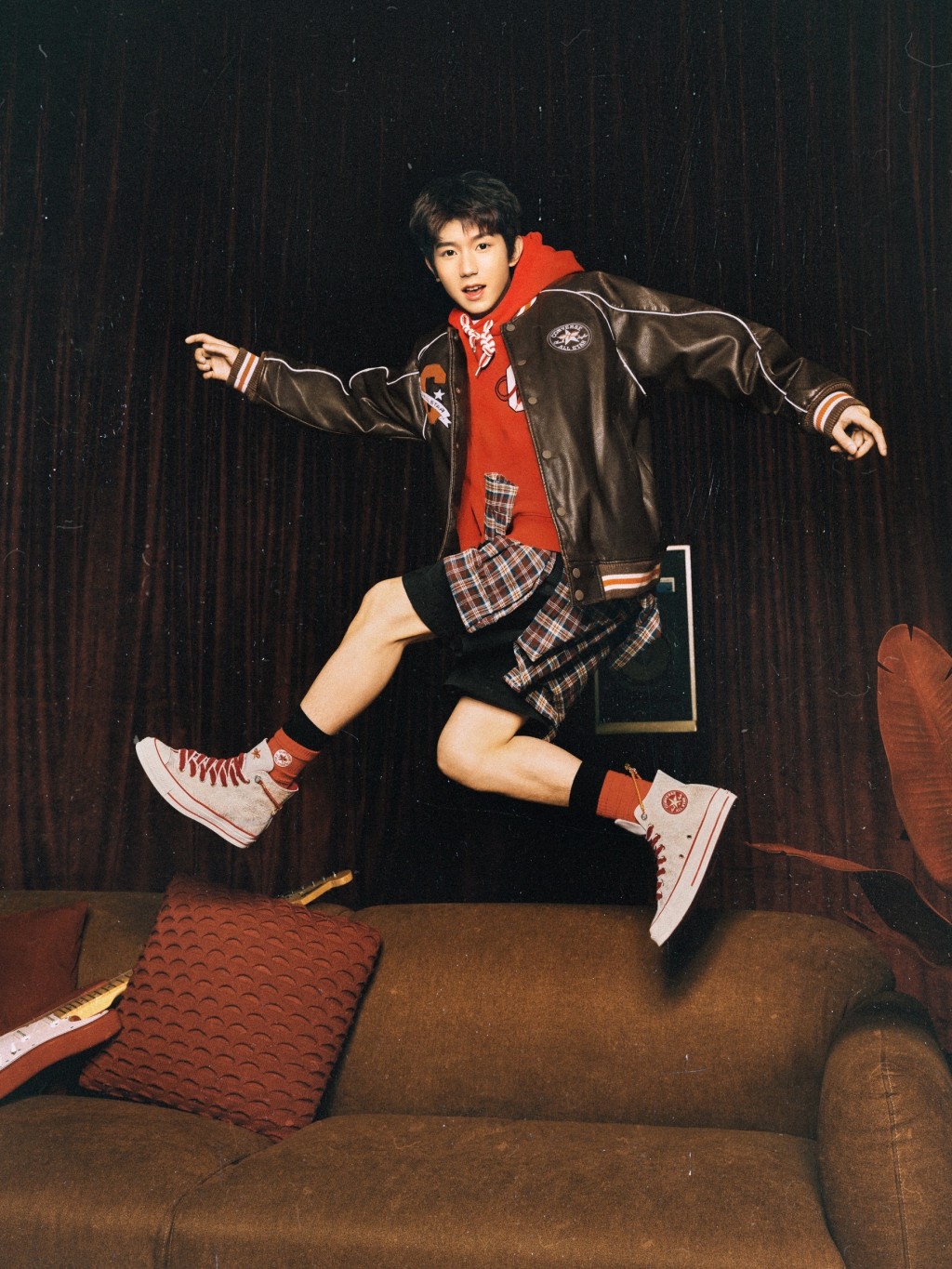 Converse Chuck 70高筒帆布鞋 $749,質(zhì)感霧光緹花鞋面結(jié)合仿蛇紋皮革,并飾以紅拼金色幸運(yùn)繩細(xì)節(jié)。