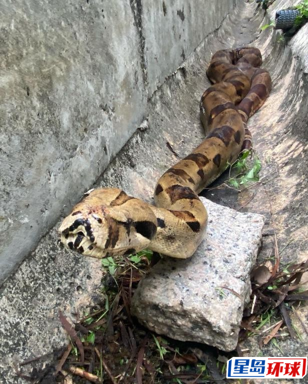 ▲體形龐大的紅尾蚺近年流行,圖中紅尾蚺盤(pán)纏于工廈外墻竹棚。
