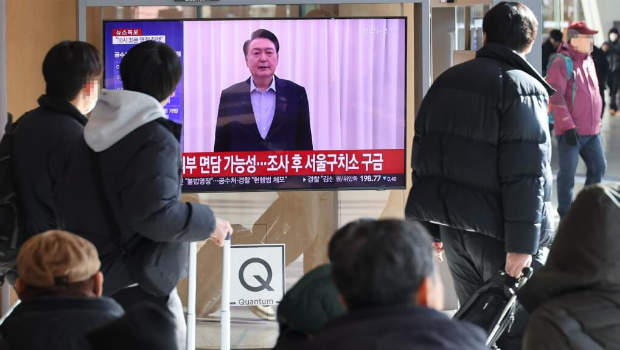 首爾車站的民眾觀看尹錫悅被捕的電視新聞報(bào)導(dǎo)。