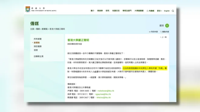 ▲香港大學曾發(fā)聲明:沒有教授推薦非本地生入學的所謂“內(nèi)推”機制。