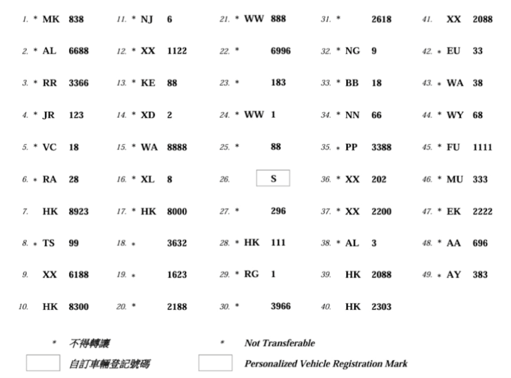 根據(jù)運(yùn)輸署的公布,今次新春拍賣包含了多個(gè)傳統(tǒng)“好意頭”車牌號(hào)碼,包括“WW 888”、“BB 18”、“HK 8000”、“WA 8888”、“AL 6688”、“RA 28”、“VC 18”、“HK 111”、“FU 1111”、“EK 2222”、“PP 3388”“183”和“1623”等,其中尤以排第25個(gè)拍賣的無(wú)字頭號(hào)碼“88”,以及排第26個(gè)拍賣的單字英文“S”,最為矚目?!?8”更注明不得轉(zhuǎn)讓。