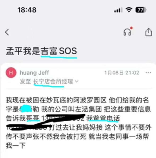 而近期網(wǎng)上也流傳一則日期為1月8日的求救信息,求救信息由番禺路店的店長“黃吉富”發(fā)出,由認識“黃吉富”的長寧店經(jīng)理“孟平”曝光?!包S吉富”稱目前身處妙瓦底的阿波羅園區(qū),并稱詐騙集團為他取了代號“希特勒”。該名員工提到,集團的名稱為“左洆集團”,并提供家人的聯(lián)絡方式,希望外界能通知其母親,也懇求外界不要聲張,因為一旦消息走漏,他可能會被打死。