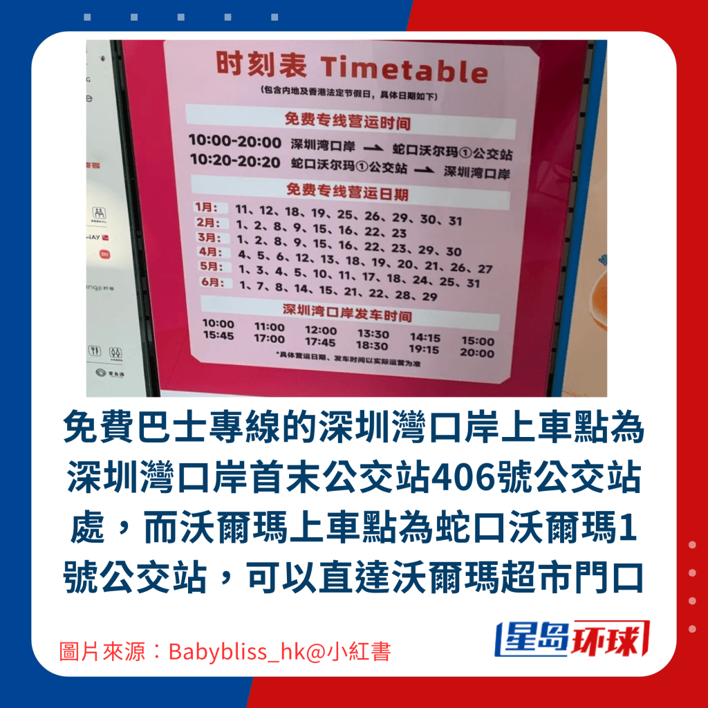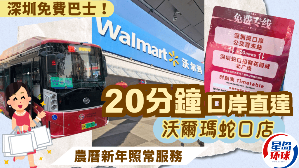 免費(fèi)巴士專線的深圳灣口岸上車點(diǎn)為深圳灣口岸首末公交站406號公交站處,而沃爾瑪上車點(diǎn)為蛇口沃爾瑪1號公交站,可以直達(dá)沃爾瑪超市門口,同時也能前往地鐵12號線四海站,乘搭地鐵前去深圳其他景點(diǎn)及商圈。 按時間表顯示,農(nóng)歷新年期間的大年初一至初五(即1月29至2月2日)亦有提供免費(fèi)巴士服務(wù),惟要留意營運(yùn)時間。