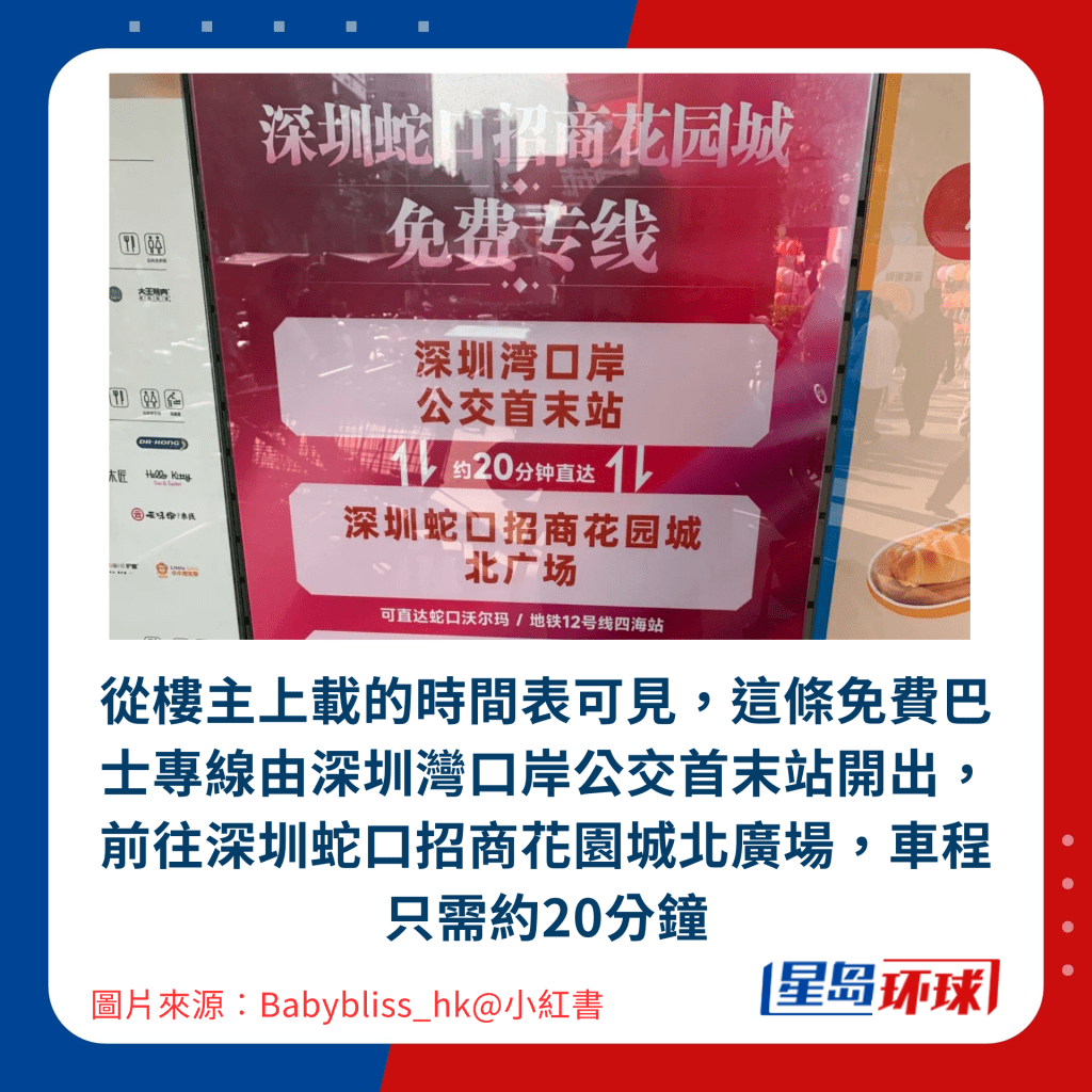 隨著深圳地鐵13號線開通后,經(jīng)深圳灣口岸往返內(nèi)地的港人愈來愈多! 加上旅客現(xiàn)時可經(jīng)設(shè)于口岸的多條免費(fèi)接駁巴士路線,前往深圳多個人氣商場及商圈,交通更方便快捷。 最近,有網(wǎng)民發(fā)現(xiàn)深圳灣口岸有一條免費(fèi)巴士路線“深圳蛇口招商花園城免費(fèi)專線”,車程只需約20分鐘,即可直達(dá)沃爾瑪蛇口店,就連大年初一至初五期間亦照常服務(wù),港人可把握機(jī)會在農(nóng)歷新年長假北上掃貨玩樂及品嘗美食!