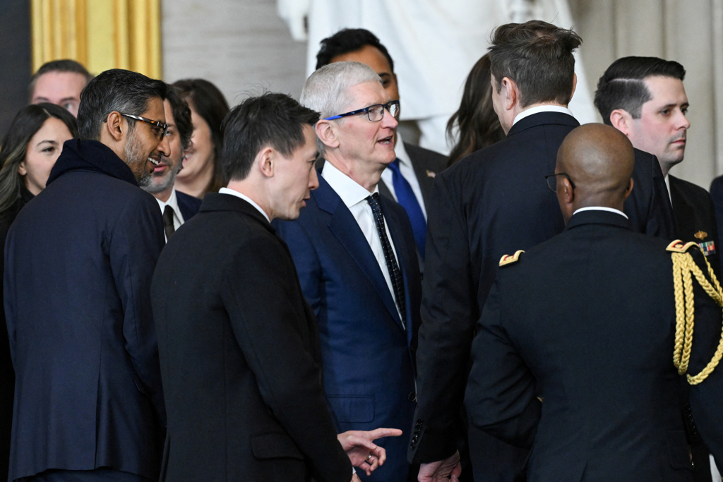 特朗普演說結(jié)束、就職大典禮成之后,馬斯克也與蘋果(Apple)執(zhí)行長庫克(Tim Cook)、TikTok執(zhí)行長周受資、谷歌執(zhí)行長皮查伊聚在一起談話。
