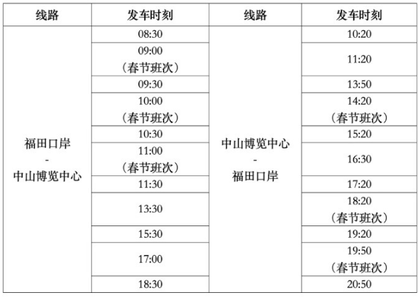以下是福田口岸至中山博覽中心及中山博覽中心至福田口岸的新增班表: