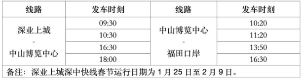 2. 深業(yè)上城至中山博覽中心深中快線 春節(jié)期間每日運(yùn)營(yíng)