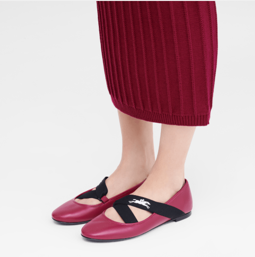 ▲芭蕾舞鞋熱潮 在今個(gè)春季回歸,可嘗試這款紅菜頭色配黑色 搭帶的設(shè)計(jì)。 $ 3,000/Longchamp