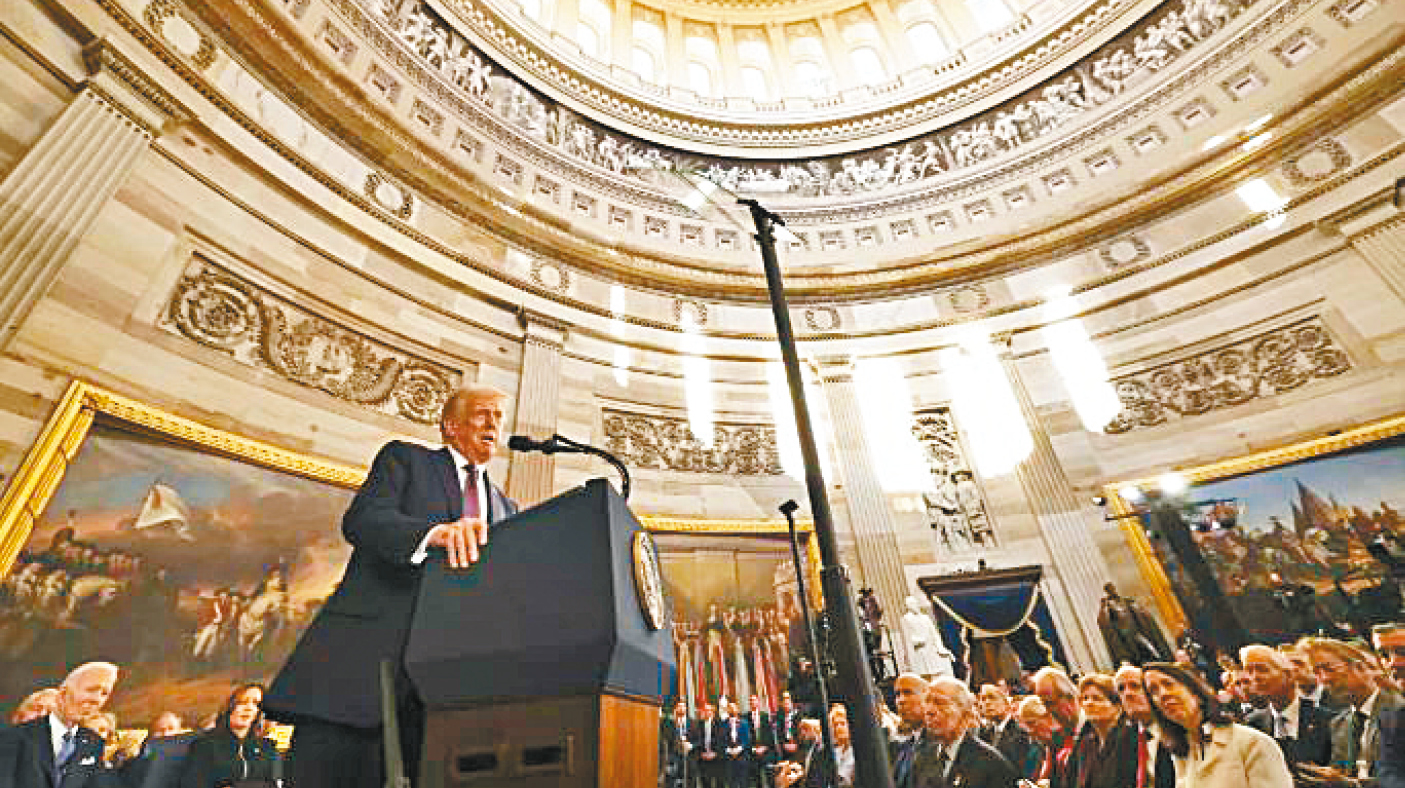 特朗普總統(tǒng)周一在美國(guó)國(guó)會(huì)大廈圓形大廳發(fā)表就職演說(shuō)。美聯(lián)社