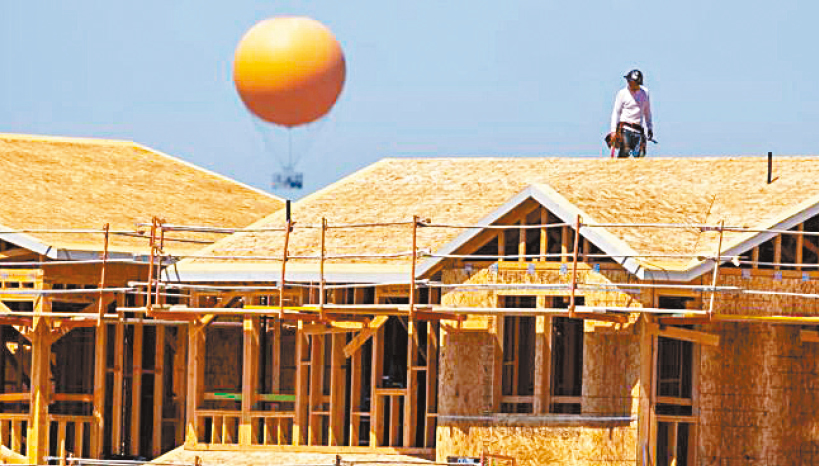 9月份,一名建筑工人站在爾灣正在建造的新房屋頂上。洛杉磯時報