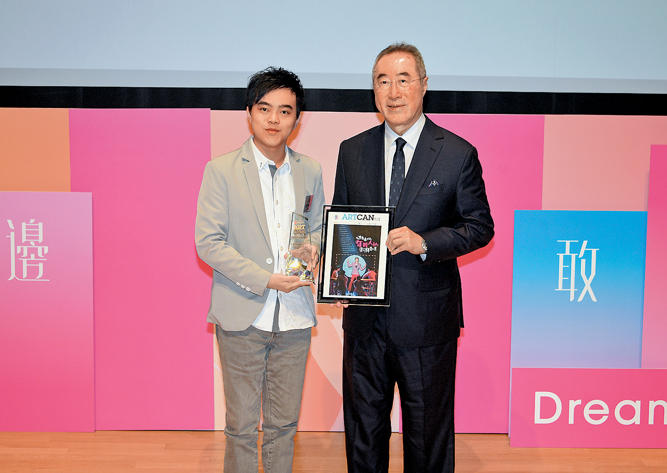 ▲唐英年頒發(fā)獎(jiǎng)座予獲獎(jiǎng)機(jī)構(gòu)代表爆炸戲棚創(chuàng)辦人及藝術(shù)總監(jiān)陳恩碩(左)。