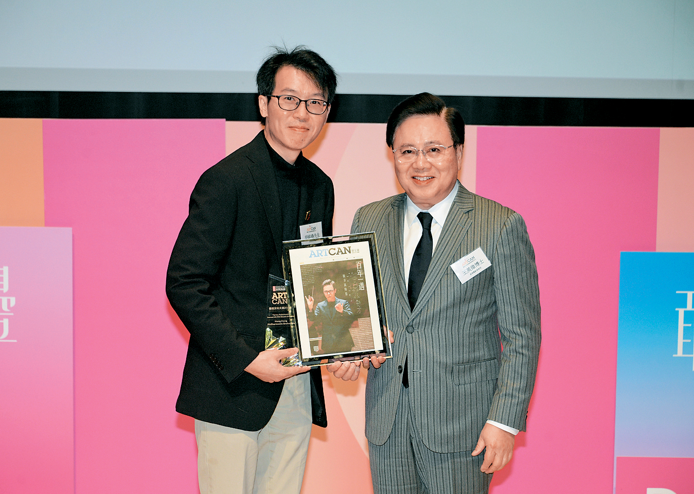 ▲王英偉頒發(fā)獎(jiǎng)座予獲獎(jiǎng)機(jī)構(gòu)代表香港管弦樂(lè)團(tuán)市場(chǎng)推廣總監(jiān)胡銘堯(左)。